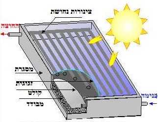 קולט השמש: כפי שציינו, קולט שמש למעשה ממיר את אנרגיית האור לחום על מנת לחמם את המים. קולטי השמש ממוקמים בכיוון דרום משום שבצהרי היום שטף האור הוא הגדול ביותר בשעות היממה. בכדי שרוב אור השמש יבלע בקולט, צבעם של הקולטים הינו שחור. צינור נחושת (בדרך כלל) נמצא בתוך הקולט (ראו איור). קרינת השמש עוברת דרך הזכוכית השקופה, פוגעת במשטחים השחורים ונבלעת. עקב כך מתחממים המשטחים ומחממים את הצינורות שצמודים להם. הזגוגית למעשה עוזרת בשמירת החום שנוצר בגוף הקולט – בדיוק כמו בחממה, כלומר האור נכנס לתוך הקולט דרך הזכוכית, הופך לחום בזכות הצבע השחור, ונכלא בתוך הקולט כי זכוכית לא מוליכה חום טוב.