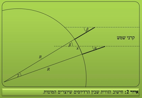זוויות α ו-β הן הזוויות בין המוטות לקרני השמש. זווית β השנייה, שבין הרדיוס לקרן השמש נובעת משוויון זוויות מתחלפות בין ישרים מקבילים. לפי המשפט הגיאומטרי הקובע כי זווית חיצונית במשולש שווה לסכום שתי הזוויות שאינן צמודות לה, ניתן לראות כי: