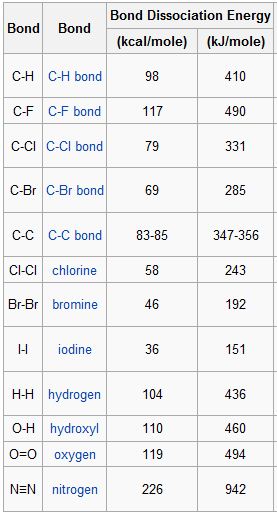 ערכי אנרגיות קשר לקשרים כימיים נפוצים, באדיבות אתר ויקיפדיה.