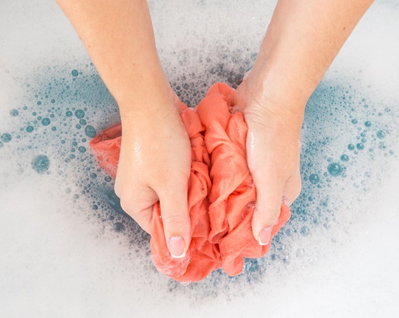 המים מפחיתים את פיזור האור בין סיבי הבד ומאפשרים ליותר אור לחדור פנימה. אישה רוחצת בגד בצבבע אפרסק | מקור: mariakray, Shutterstock
