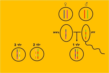 הערה- הכרומוזומים ממוספרים 1 עד 22 וכרומוזום 23 הוא כרומוזום מין (X או Y). באיור מוצג כרומוזום אחד מכל הורה (ולא כל ה 46) לשם הפשטות, אך ההסבר נכון לגבי כול הכרומוזומים.