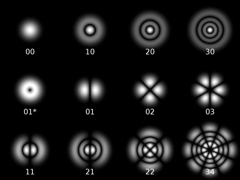 דפוסים שונים של החתך הרוחבי של אלומת האור כתלות בצורת המהוד. התמונה לקוחה מויקיפדיה.