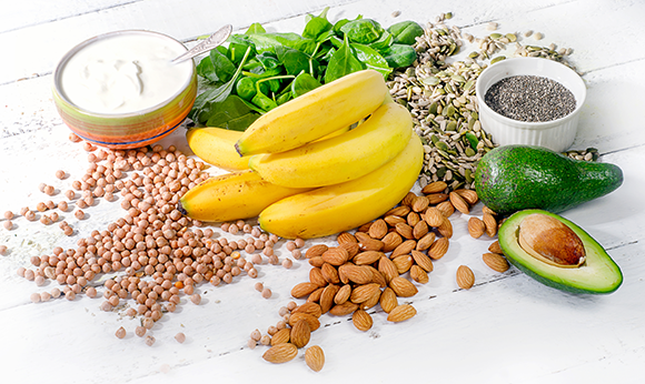 המגנזיום מגיע לגוף האדם במי השתייה וגם תזונה, בייחוד של ירקות ופירות. עם זאת, ריכוזו משתנה ממאכל למאכל ואפילו בין ירקות ופירות מאותו מין. כמה מאכלים שיש בהם מגנזיום | Shutterstock, Tatjana Baibakova