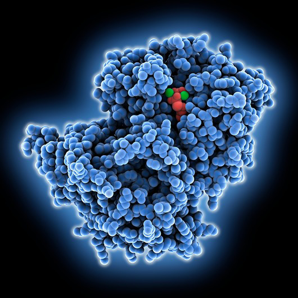מעורב בפעילותם של לפחות 300 אנזימים ובתהליכים חיוניים רבים. מבנה של האנזים איזופרן סינתאז, עם יוני מגנזיום בירוק | Laguna Design / Science Photo Library