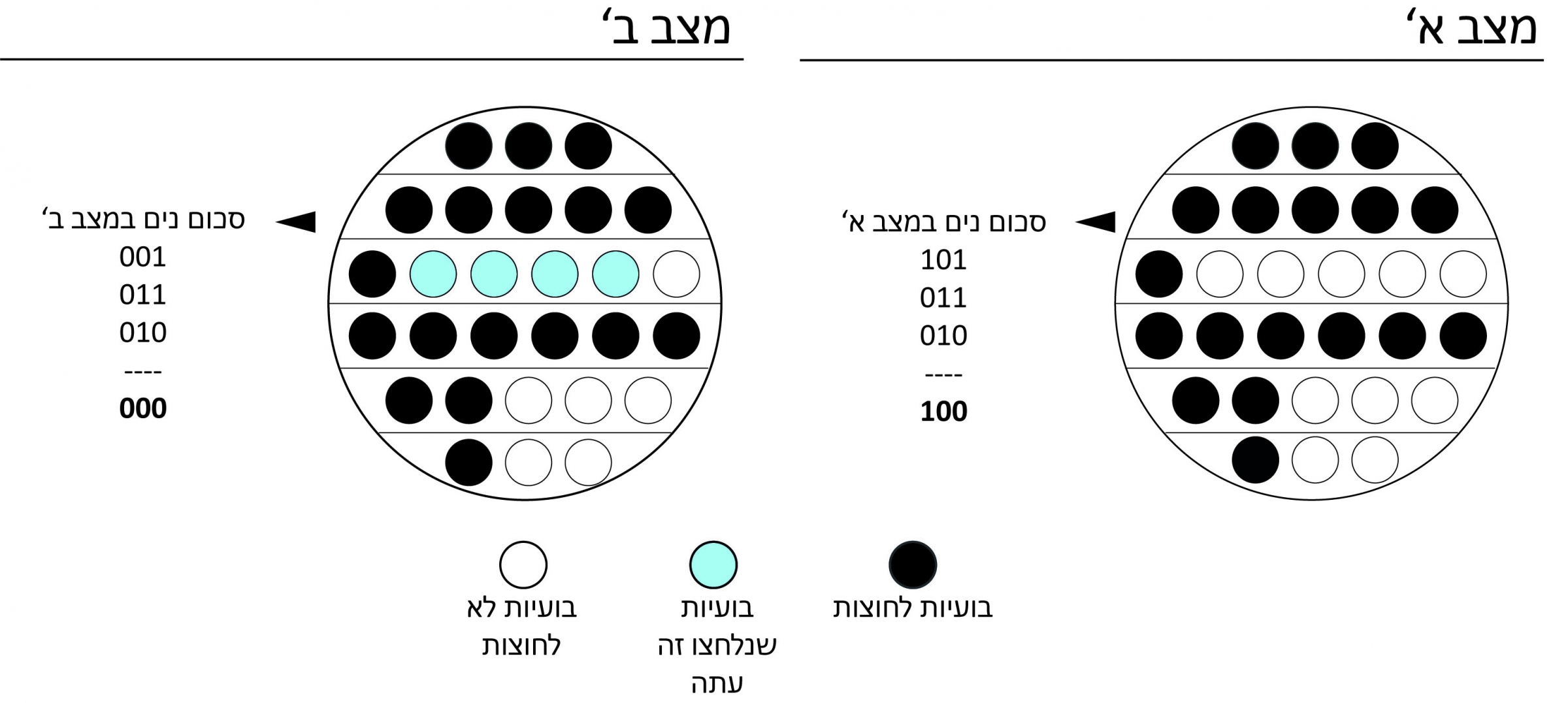 עלינו להביא את הלוח למצב שסכום נים יתאפס (1 יופיע מספר זוגי של פעמים בכל עמודה). נצמצם את השורה שבה חמישה פצפצים לפצפץ יחיד (מצב ב'), ונחשב את סכום נים מחדש (סכום נים מצב ב').