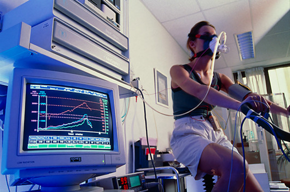 כדי לבדוק את הכושר הגופני של אדם, מודדים את צריכת החמצן המרבית שלו במאמץ. אישה רוכבת על אופניים במבחן מאמץ | BSIP, Laurent / B. Hop Ame / Science Photo Library