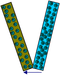 1. כאשר 2 מתכות שונות נוגעות זו בזו נוצר ביניהם מתח חשמלי: כל מתכת בנוייה מאלקטרונים (הטעונים מטען חשמלי שלילי) חופשיים הנעים בחופשיות בתוך מה שנקרא 'ים האלקטרונים' אשר מסביב לאטומים הטעונים מטען חשמלי חיובי. (חופשיות התנועה של האלקטרונים היא הסיבה שבגללה מתכות מוליכות חשמל, לחצו על הקישור הבא להסבר מפורט על ים האלקטרונים ועל מוליכות חום וחשמל במתכות). למתכות שונות – האלקטרונים החופשיים נמצאים בצפיפות שונה (או, במינוח יותר מדוייק: האלקטרונים נמצאים ברמת אנרגיית-בסיס שונה), כאשר 2 מתכות שונות נוגעות זו בזו, אלקטרונים מהמתכת בעלת הצפיפות הגבוהה (או הרמה האלקטרונית הגבוהה) ינועו לעבר המתכת בעלת הצפיפות הנמוכה, כפי שאפשר לראות באיור הבא, האלקטרונים ינועו מהמתכת מימין למתכת משמאל: