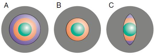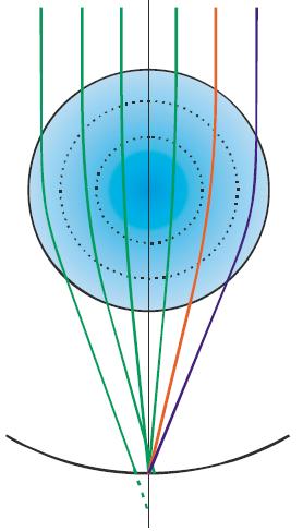 בתמונה למטה ניתן לראות דוגמא של עדשה בעלת 3 מוקדים שונים. ניתן לראות למשל איך אזורים שונים בעדשה ירכזו את אורך הגל של הצבע הירוק במוקדים שונים: לפני, אחרי או בדיוק על הרשתית (צד שמאל). מצד ימין ניתן לראות איך אורכי גל שונים מתרכזים ע"י אזורי העדשה השונים בדיוק על הרשתית (ה"מוקד").