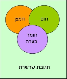 כלומר כדי ליצור אש צריך בתור התחלה חומר דלק וחמצן וטמפרטורה גבוהה מספיק ואז נוצרת תגובה בין החמצן באוויר לאדים של חומר הדלק