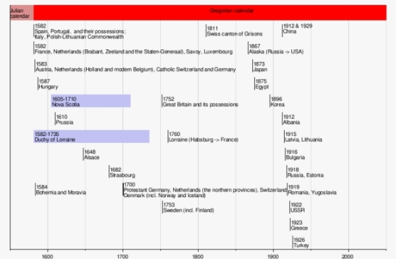 תרשים המראה את השנה בה מדינות שונות אמצו את הלוח הגרגוריאני המקובל כיום. תמונה באדיבות ויקיפדיה