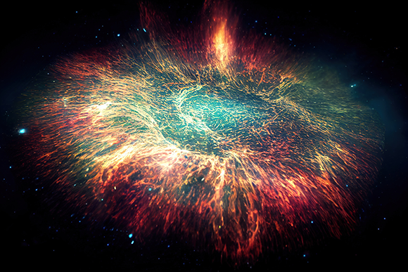 מראה השמיים בצבעים זוהרים כשמסתכלים בהם דרך טלסקופ רגיש לגלי רדיו. הדמיה של קרינת הרקע הקוסמית | מקור: Declman Hillman, Shutterstock