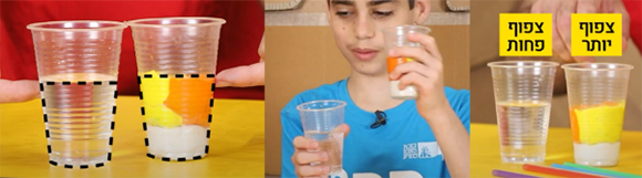 משמאל לימין: מים ופלסטלינה באותו נפח; ילד משווה בין המשקל של שתי הכוסות; כוס הפלסטלינה כבדה יותר, ומכאן שהיא צפופה יותר | צילומים: ליאורה זיתון