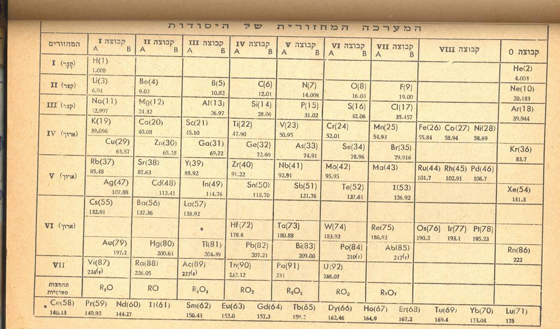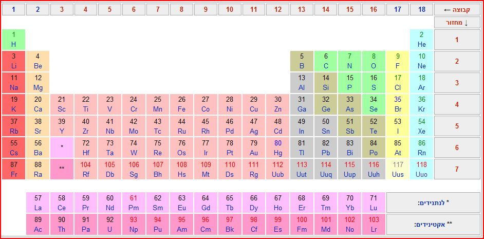 נוסח השאלה המלא: בדרך כלל מופיעה הטבלה המחזורית עם שתי שורות מחוץ לטבלה, אלה שורות שמתחילות ביסודות מס 58, 90 קראתי וראיתי שניתן לצייר את הטבלה המחזורית כאשר 2 השורות האלה משולבות בה, ושבעצם מקובל לצייר אותן בחוץ רק מסיבות של נוחות-כלומר כדי לא לקבל טבלה ארוכה מידי. שמעתי מאידך ,ממקור אחר שאם משלבים את 2 השורות בטבלה, משתבש סדר הקבוצות-וזאת מפני שיש ליסודות שבשורות האלה סידור מיוחד של קליפות האלקטרונים.ולכן הטבלה חייבת להיות מפוצלת. אני נוטה לקבל את הגירסה שהטבלה פוצלה מסיבות של נוחות ושאפשר לצייר אותה כטבלה אחת מה דעתם של המומחים ??