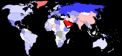 מדינות בכחול = יותר נשים, מדינות באדום = יותר גברים (ויקיפדיה).
