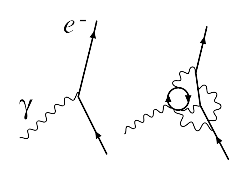 בתמונה דוגמה לנורמליזציה באמצעות דיאגרמת פיינמן. התהליך המסובך בצד ימין כולל ארועים בעלי אנרגיות גבוהות. תהליך רנורמליזציה יכול להוציא אנרגיות אלו מן המערכת, ולהפוך דיאגרמה מסובכת כמו זו שבצד ימין לדיאגרמה פשוטה כמו זו שבצד שמאל. כמובן שדבר מה משתנה בתהליך, וזהו קבוע הצימוד בין האלקטרון (המסומן על ידי קו ישר וחץ) לפוטון ( המסומן על ידי קווי גלי)