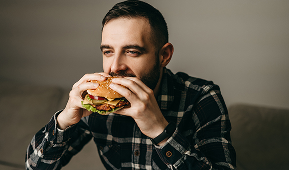 הקביעה מהו אוכל מנחם משתנה בהתאם למין ולגיל, ושונה גם מתרבות לתרבות. גבר אוכל המבורגר | LL_studio, Shutterstock