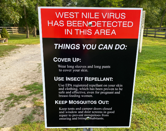 שינוי האקלים ופעילות האדם מסייעים להתפשטות היתושים והמחלה. שלט אזהרה מפני קדחת מערב הנילוס, עם הנחיות כיצד להימנע מעקיצות יתושים | צילום: WoodysPhotos, Shutterstock