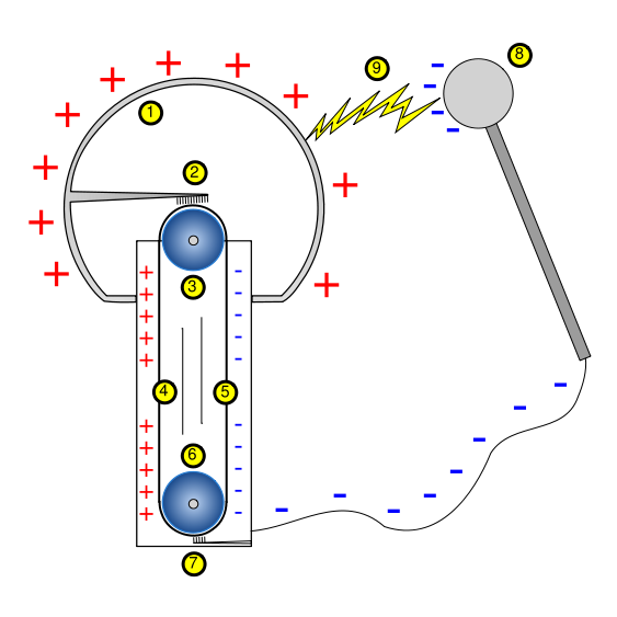 החגורה מושכת מטענים שליליים מהכדור החלול העליון (1) ו"דוחפת" אותם לכדור המתכת (8). בצורה זו נוצר עודף מטען שלילי בכדור (8) ועודף מטען חיובי בכדור החלול (1). ככל שהמכשיר ממשיך לפעול יותר זמן כך הפרש הפוטנציאלים גדל.