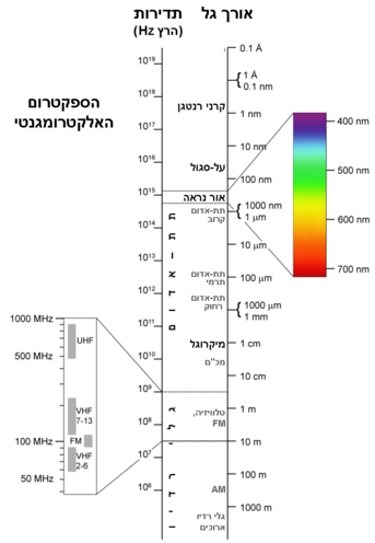אורכי הגל והתדירויות של הספקטרום האלקטרומגנטי (המכיל את כל סוגי הקרינות מרדיו, מיקרוגל, אור נראה, אולטרא סגול, רנטגן וגו’) תמונה באדיבות ויקיפדיה
