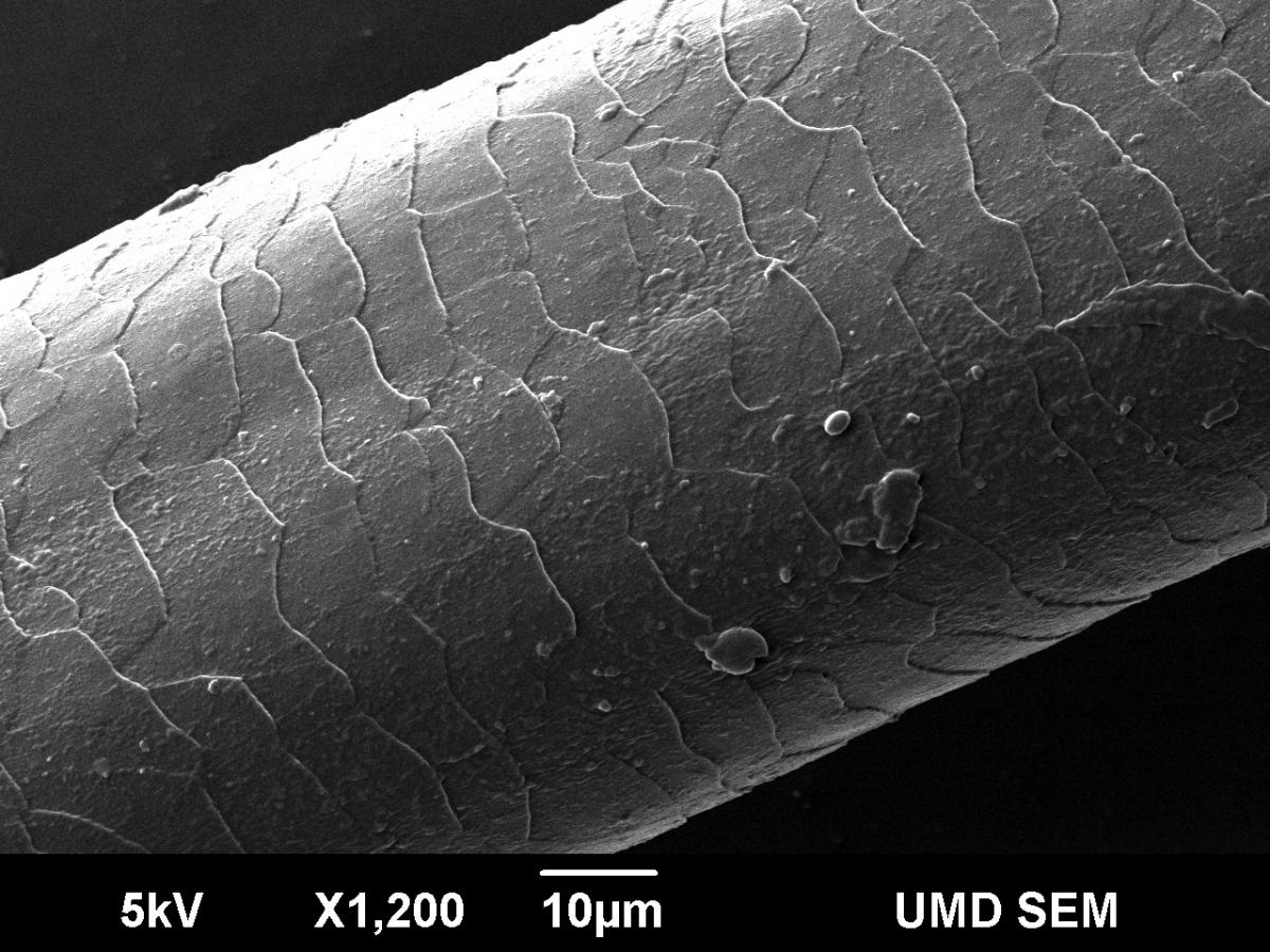 שערת אדם במיקרוסקופ אלקטרונים סורק | צילום, בריאן בנדלי; נלקח מהאתר NISE לחינוך מדעי
