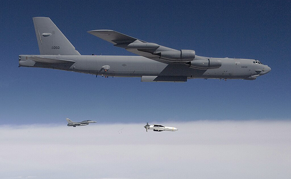 אחת הפצצות החודרות הגדולות ביותר. מטוס B-52 אמריקאי מטיל באימון פצצת GBU-57, במשקל 14 אלף קילוגרם ובאורך ששה מטרים | צילום: US DoD, Public Domain