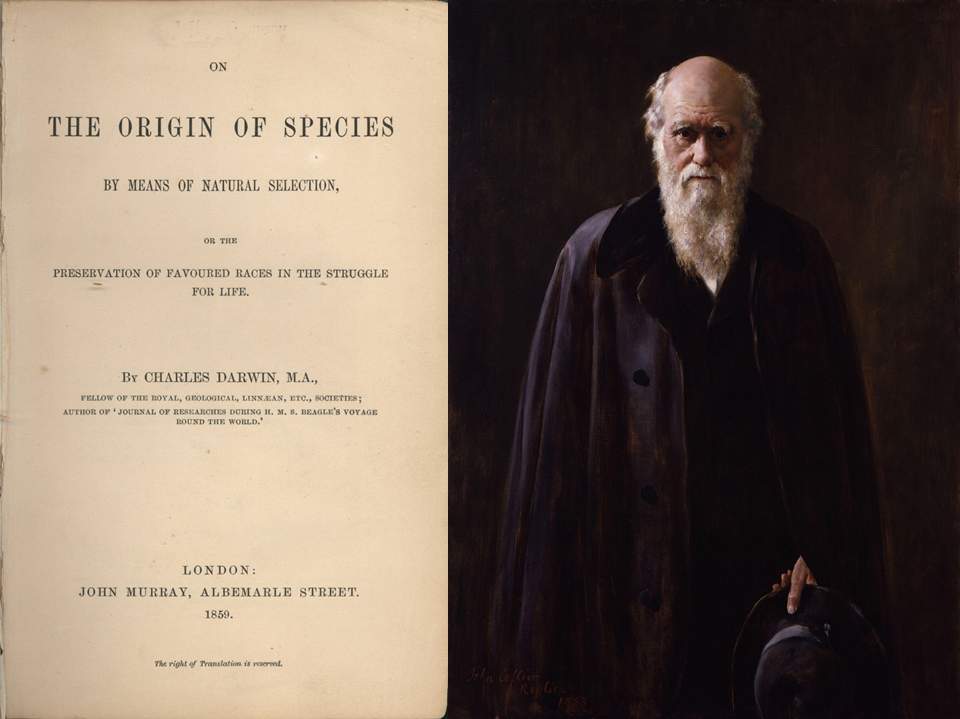 דרווין ושער ספרו "מוצא המינים" | תמונה: ג'ון קולייר, ויקיפדיה