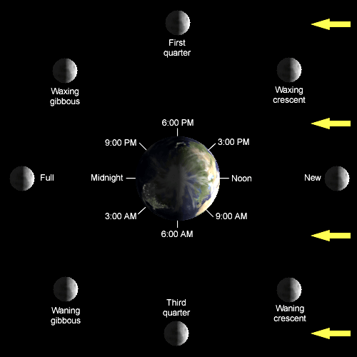 מכיוון שזמן הסיבוב של הירח סביב צירו זהה לזמן ההקפה שלו את כדור הארץ הוא לעולם מציג רק צד אחד שלו לעברנו. כאשר הירח מצוי בצד הנגדי של השמש (כלומר כדור הארץ ביניהם) הירח יראה מלא מכיוון שכל הצד הפונה אלינו מואר; כאשר הירח מצוי בין כדור הארץ לשמש הירח לא נראה מכיוון שהצד הפונה אלינו נמצא כרגע בצל ולא מואר באור השמש. מצבי הביניים, כפי שניתן לראות בתמונה (השמש מאירה מכיוון ימין), יתנו את מופעי הירח השונים. המיקום היחסי של הירח (ביחס לכדור הארץ ולשמש) גם ישפיע על מועד זריחת ושקיעת הירח וכן על משך זמן הארתו.