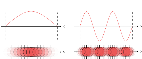שתי פונקציות גל של חלקיק בקופסא חד-מימדית. בציור התחתון, בהירות הצבע פרופורציונלית לסיכוי למצוא את החלקיק כפונקציה של מיקומו במרחב. התמונה לקוחה מויקיפדיה