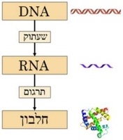 תרשים מופשט המתאר את מסלול סינתזת החלבונים בתא.