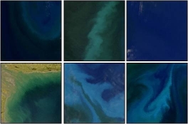 גוונים שונים של מים בים (חלקם בגלל סחיפת משקעים). תמונה באדיבות נאסא
