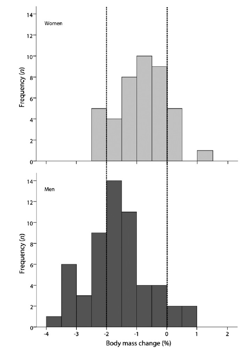 אובדן מסת גוף במהלך מירוץ אצל נשים (למעלה) ואצל גברים (למטה). אובדן של שני אחוז ומעלה. מתוך Scandinavian Journal of Medicine & Science in Sports 2013