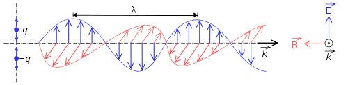 גל אלקטרומגנטי המתקדם משמאל לימין, כאשר kהוא התנע, השדה חשמלי E והשדה המגנטי B ניצבים זה לזה. λ הוא אורך הגל ו-qהוא המטען החשמלי.