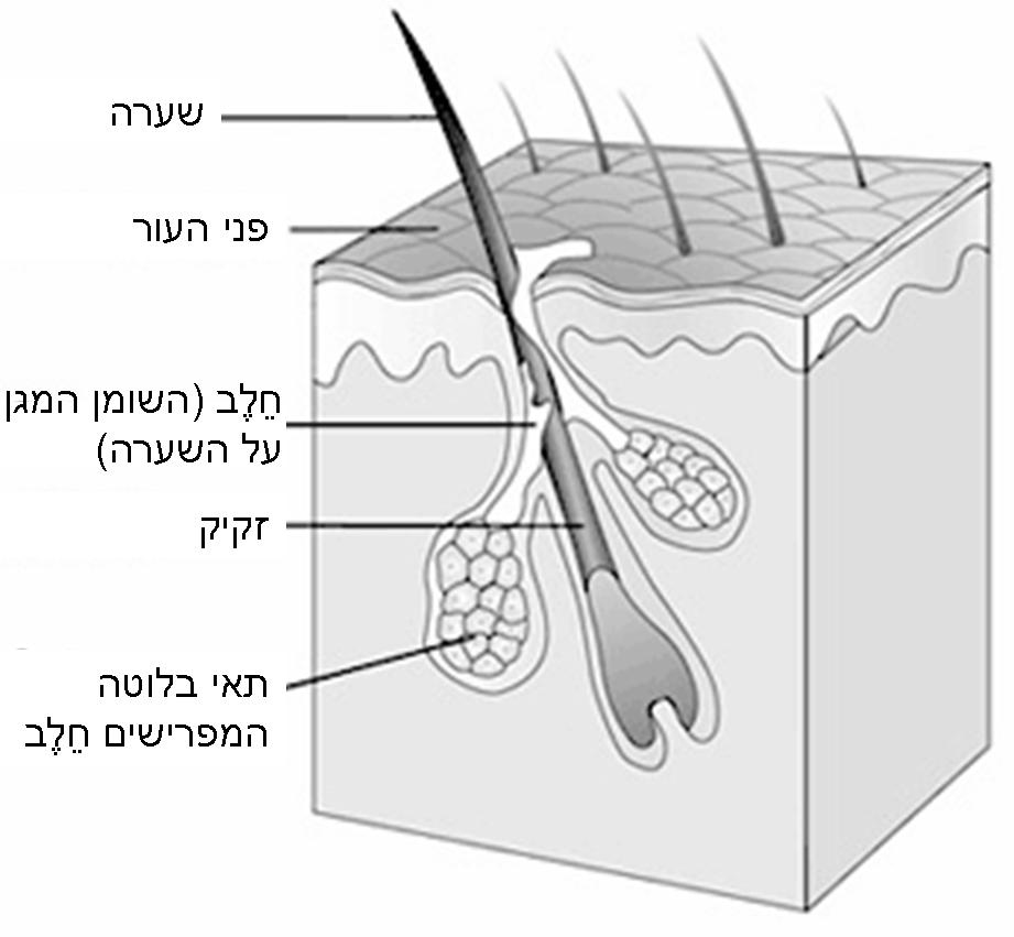 תמונת חתך של זקיק השערה: ניתן לראות את השערה מהקצה ועד לשורש הממוקם בשכבה פנימית של העור. לצד הזקיק ממוקמות בלוטות חֵלֶב המפרישות את השכבה השומנית המגנה על השיער.