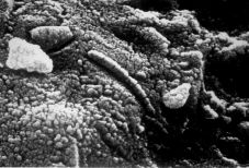 דגימה של מטאוריט שהגיע ממאדים. יש חוקרים הטוענים כי המבנים הנראים בתמונה הם חיידקים מאובנים (או לפחות התבנית שלהם).