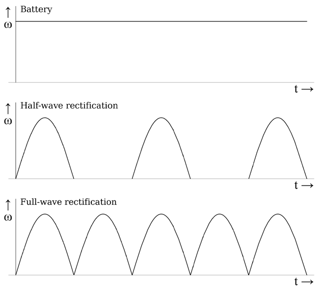 זרם חשמלי יכול להיות, כפי שציינת, משני סוגים: זרם ישר (dc) וזרם חילופין (ac). האיורים לעיל מתארים כולם זרם ישר או שעבר יישור (כאשר הציר המאוזן הוא זמן, והציר המאונך הוא עצמת הזרם), שבו המטענים זורמים בכיוון אחד. הגרף העליון מתאר זרם ישר המיוצר ע"י סוללה, אשר הסימנים של ההדקים שלה (הקוטביות שלה) אינם משתנים עם הזמן. אלקטרונים נעים מההדק השלילי שדוחה אותם, אל ההדק החיובי שמושך אותם, תמיד בכיוון אחד. הגרפים התחתונים מייצגים זרם ישר אשר עבר המרה מזרם חילופין. בזרם חילופין האלקטרונים מחליפים כיוון מסביב לנקודת ייחוס קבועה למדי (50 פעמים בשניה עבור זרם של 50 הרץ). בתוך הממיר יש דיודה, רכיב אלקטרוני אשר משמש כשסתום חד כיווני, ומאפשר לאלקטרונים לזרום בכיוון אחד בלבד. מכיוון שזרם חילופין זורם בשני הכיוונים, רק מחצית מכל מחזור תעבור דרך הדיודה. התוצאה היא הגרף האמצעי – זרם ישר בעצמה לא קבועה שמנותק מחצית מהזמן. בפועל משתמשים בזוג דיודות, והתוצאה היא היפוך קוטביות בכל חצי מחזור, וכך אין מאבדים מחצית מן המחזורים (גרף תחתון). נכון הדבר שבכל חצי מחזור הזרם מתאפס באופן רגעי (כי הוא החליף את כיוונו), כפי שכמנדנדים ילד על נדנדה הוא עוצר באופן רגעי בגובה המקסימלי ובגובה המינימלי (אבל התאוצה אינה מתאפסת).