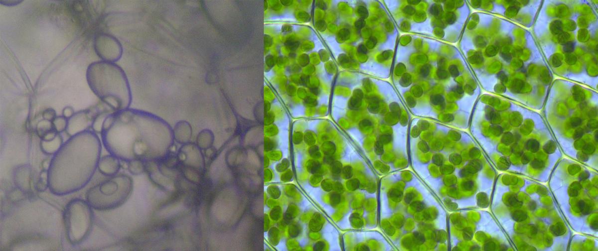 מימין: תאי צמח ובתוכם כלורופלסטים. תא בודד יכול להכיל 50 פלסטידות ואף יותר. משמאל: עמילופלסטים בתא של תפוח אדמה.