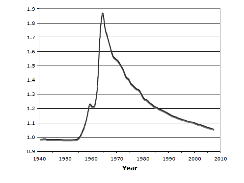 איור 1: כמויות פחמן 14 באטמוספירה (בהמיספרה צפונית) בחמישים השנים האחרונות. ניתן לראות קפיצה בתחילת שנות השישים לרמות פי 1.9 מהכמות שנוצרת באופן טבעי מקרניים קוסמיות. (מתוך Carbon-14 Bomb-Pulse dating ע"י B.A. Bucholz)