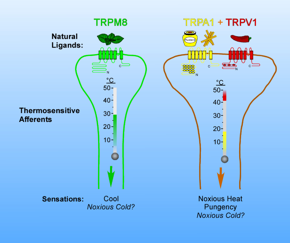 תעליות TRP-V1, TRP-M8 ו TRP-A1 כפי שהן מתוארות במאמר של David D McKemy מאוניברסיטת קליפורניה הדרומית (McKemy Molecular Pain 2005 1:16 doi:10.1186/1744-8069-1-16).