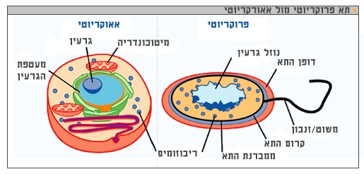 השוואה בין הפרוקריוטים לאאוקריוטים המפותחים יותר אבולוציונית (ויקיפדיה).
