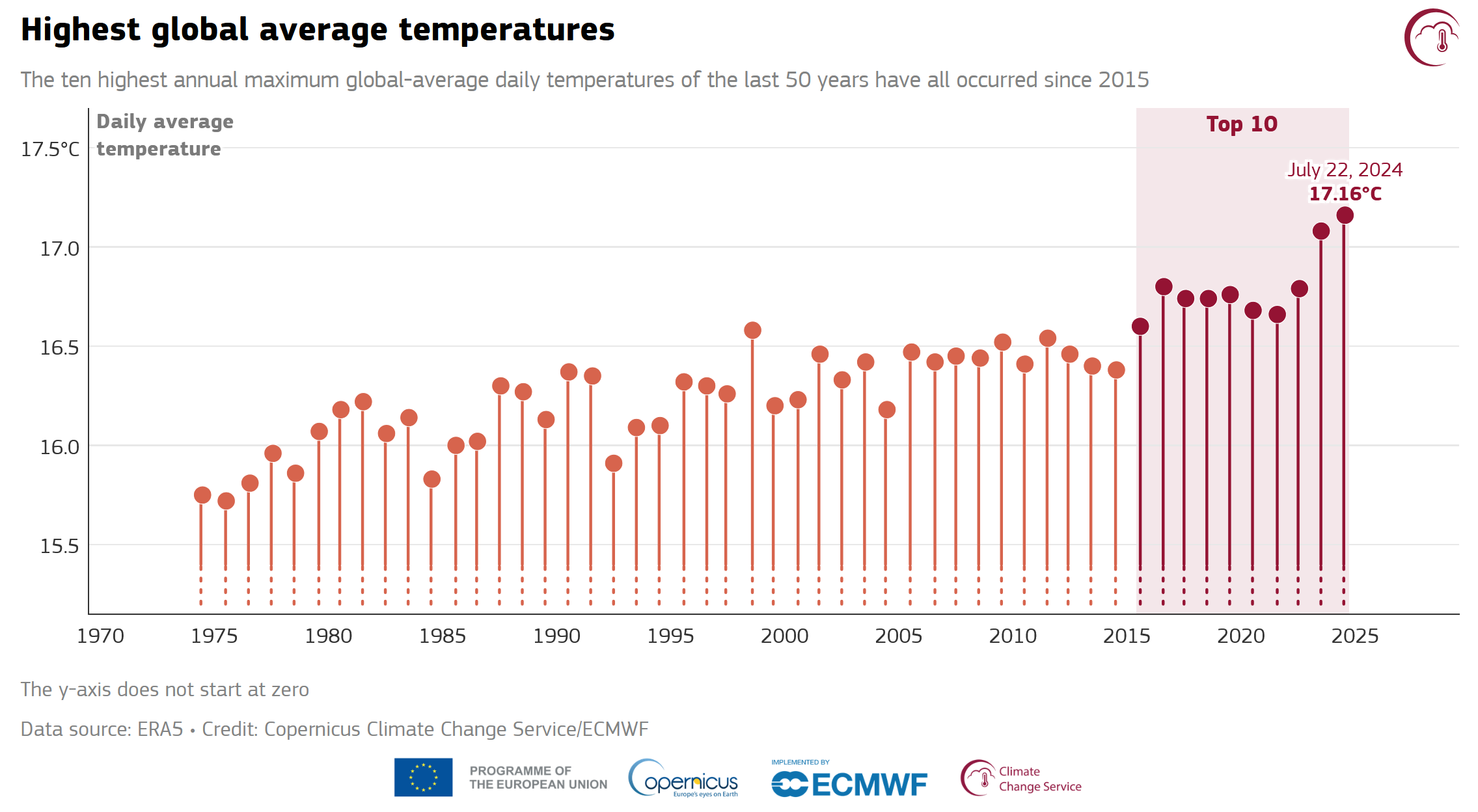 בשנים האחרונות נשברים שוב שוב שיאי טמפרטורה. הטמפרטורות היומיות הממוצעות הגבוהות ביותר ב-50 השנים האחרונות | מקור נתונים: ERA5, מקור גרף: C3S/ECMWF