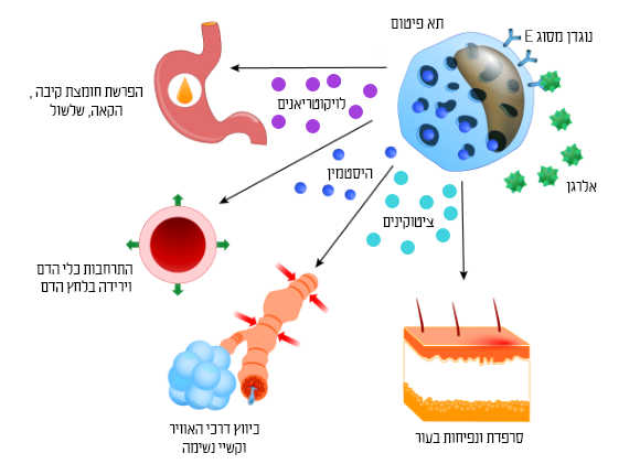 כשאדם עם אלרגיה נחשף לאלרגן, קבוצת נוגדנים בשם אימונוגלובולינים מסוג E נקשרים בעת ובעונה אחת לחומר הזר ולקולטנים בתאים מסוימים של מערכת החיסון. תא פיטום מופעל ופני אישה בזמן תגובה אנפילקטית | BruceBlaus, Wikipedia