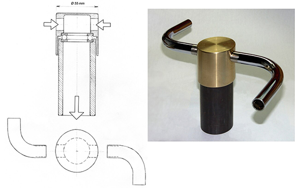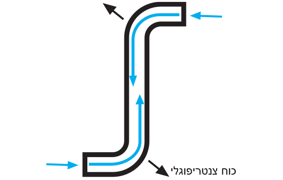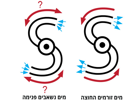 החוקרים הראו שהכוח הצנטריפוגלי, שפועל על זרם המים כאשר הוא פונה בחלק העקמומי של הצינור, גורם להסטת הזרם ממרכז הצינור לכיוון דופנות הצינור – בכל כיוון של הצינור לכיוון ההפוך. ההפרש בזוויות הזרם בנקודת המפגש בין הזרמים גורם לסיבוב | איור: ליאת פלי