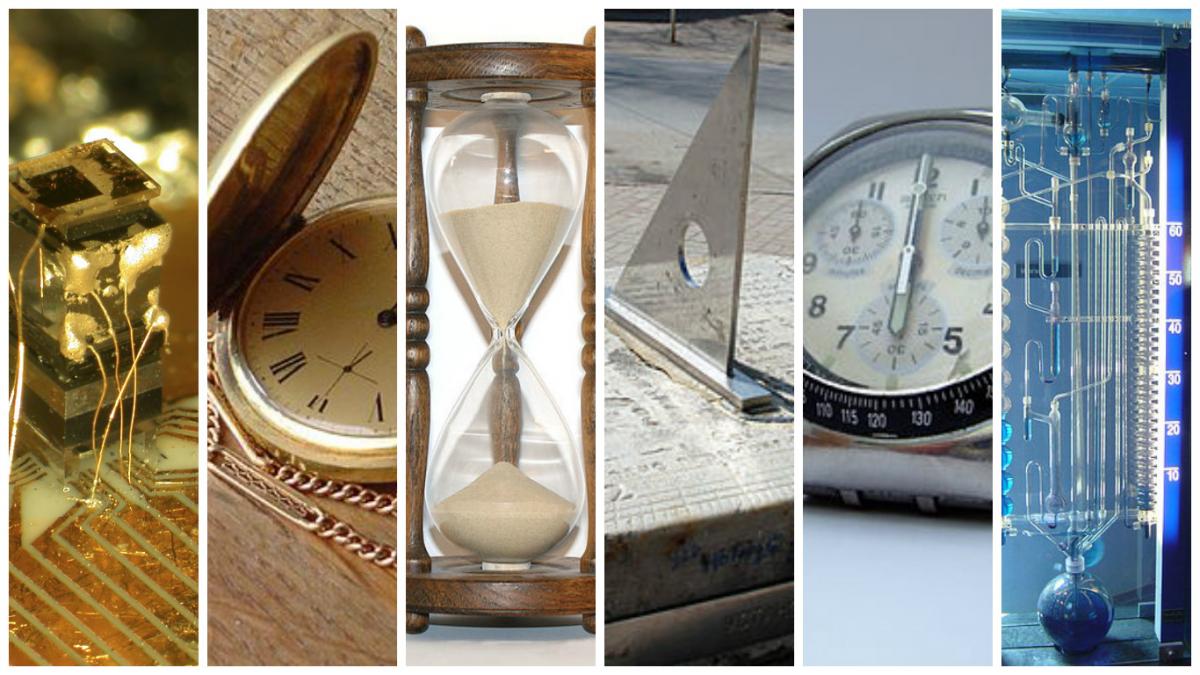 סוגי שעונים (מימין לשמאל: מים, קוורץ, שמש, חול, מכני וגרעיני) | צילומים: ויקיפדיה
