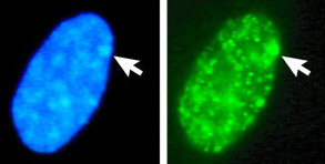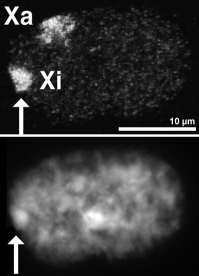 בתמונה העליונה נצבעו 2 כרומוזומי הX בתא. בתמונה תחתונה נראה בצביעה שונה של אותו התא רק כרומוזום X המושתק (קרי גופיף בר). תמונה באדיבות ויקיפדיה.