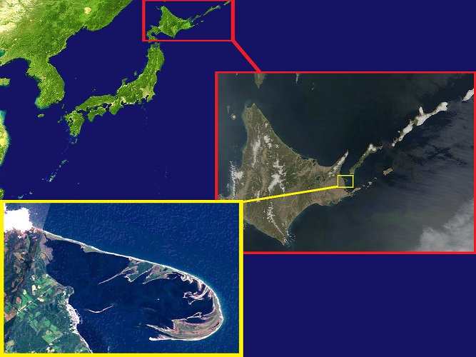 איור 1: משמאל מעלה – מפת יפן. מימין ובאדום – מפת האי הוקאידו, האי השני בגודלו ביפן. משמאל, מטה ובצהוב – חצי האי נוטצוקה. התמונות באדיבות נאס"א