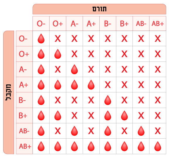 טבלת התאמה בין סוג הדם של התורם לזה של המקבל. למשל, בעל סוג דם O מינוס יכול לתרום לכולם | מקור: Ph-HY, Shutterstock