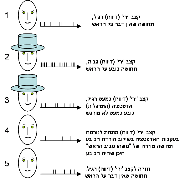 3) כעבור זמן, הניירונים עוברים אדפטציה, מפסיקים לירות בקצב מהיר (יורדים ל-7 גירויים בשנייה), וכמעט לא מרגישים את הכובע על הראש.