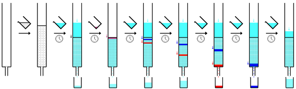 הפרדת תערובת חומרים (אדום וכחול) על ידי הזרמתם על פני קולונת עמודה. כל חומר יוצא מהקולונה בזמן אחר. תמונה באדיבות ויקיפדיה