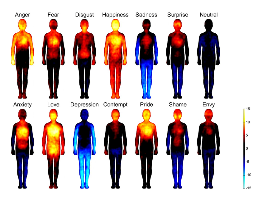 מפות של תחושות גופניות ברגשות שונים. הצבעים החמים מציינים עלייה בפעילות והקרים מציינים ירידה בפעילות | מתוך המאמר של Nummenmaa L et al. ב-PNAS, גליון 111, 651-646, 2014.
