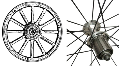 בתמונות למטה ניתן לראות גלגל עגלה (משמאל) ולידו גלגל אופניים (מימין) וניתן בהחלט לראות שבעוד שבגלגל העגלה החישור ניצב לציר הרי שבגלגל האופניים הוא משיק לציר.